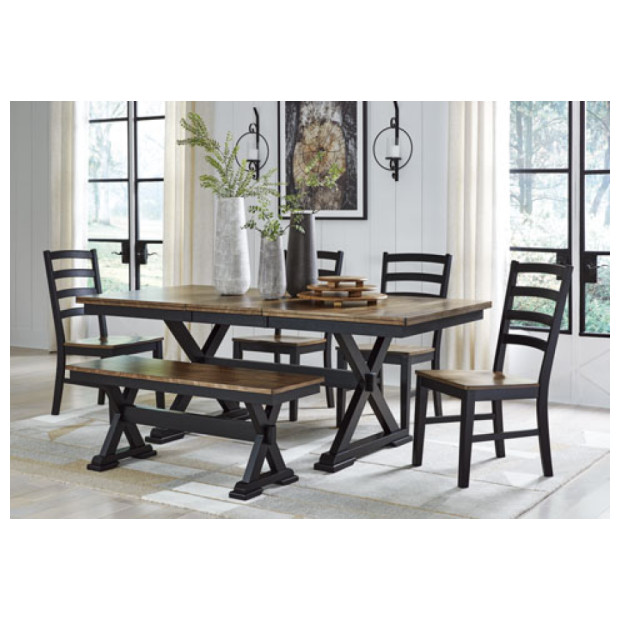 Raise the bar on modern farmhouse style with this dining extension table set. Its handsome good looks are accentuated with a two-tone finish and a casual butcher block veneer top. The sturdy silhouette adds a hearty element, whether your style is vintage, country or eclectic. This richly crafted multi-use table extends to seat eight comfortably, serving up charm wherever folks decide to take a seat. Set includes a stylish Bench and 4 comfortable chairs along with the extended table