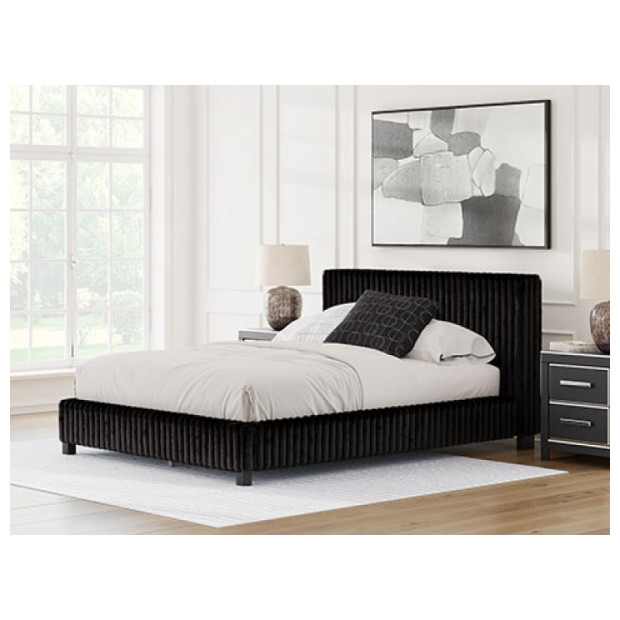 If casual and contemporary is your jam, you’re gonna love this queen upholstered bed. Covered from head to toe in a luxuriously soft black corded fabric, it has a chic flair that's sure to wake up your inner sanctum’s style. We’re talkin’ relaxed refinement.