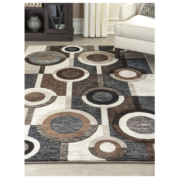 Talk about bringing modern pop to a space. With its multilayered geometric design and pleasing palette of black, brown and cream tones, this area rug is decidedly bold without coming on too strong.