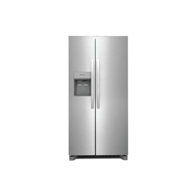25.6 cf Side by Side Stainless Refrigerator with EvenTemp Cooling System, Adj. Glass Shelves, Clear Crispers, Dairy Compartment, (2) Clear Gallon Door Bins, (2) Clear 2L Door Bins, (2) Adjustable Wire Freezer Shelves, Internal Electronic Controls, LED Lighting, Energy Star. Image for illustration purpose only. Actual product may vary slightly.