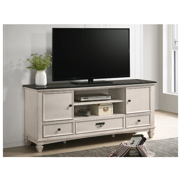 This sleek two toned TV Stand will make a statement in your living room. It features two doors, three drawers, and two open shelves in the center.