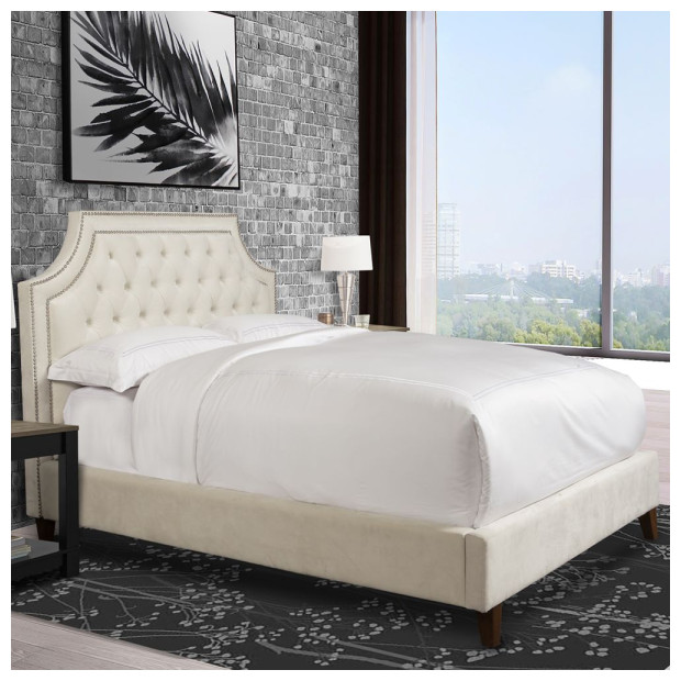 Queen upholstered bed in a beautiful champagne cover with a button tufted headboard and nailhead trim.