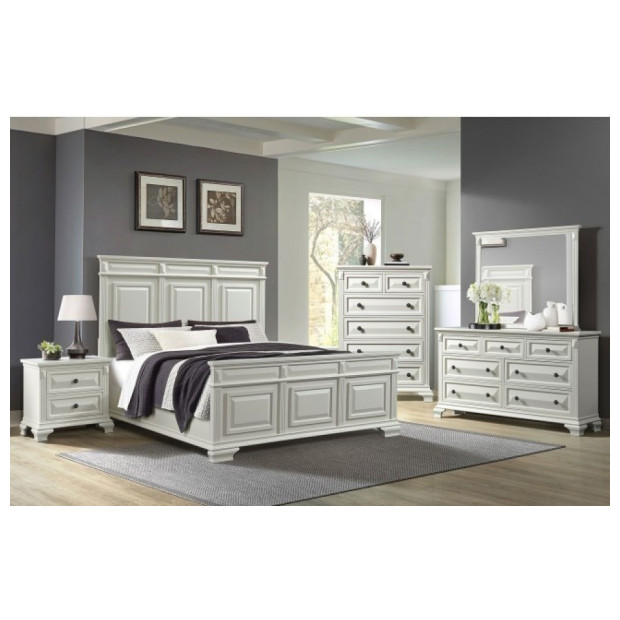 This luxurious antique off-white finish and tri-panel design on the headboard and footboard, this bedroom set will instantly transform your space into a serene sanctuary. The ample drawer space provides plenty of storage for all your essentials, while the sleek metal hardware adds a touch of modernity. includes queen bed, dresser, nightstand and mirror